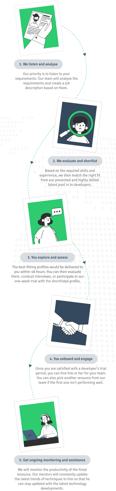 Irrespective of the size of the project and the number of resources you are hiring, we try to deliver results in the shortest time span possible. However, to help us deliver quickly and in the shortest time span possible, please provide us with a clear picture of your requirements, the time span at which each sprint or phase should be completed, the kind of skills and resources you are looking for in a remote office and your desired deadline. Be assured, we love getting things done faster.